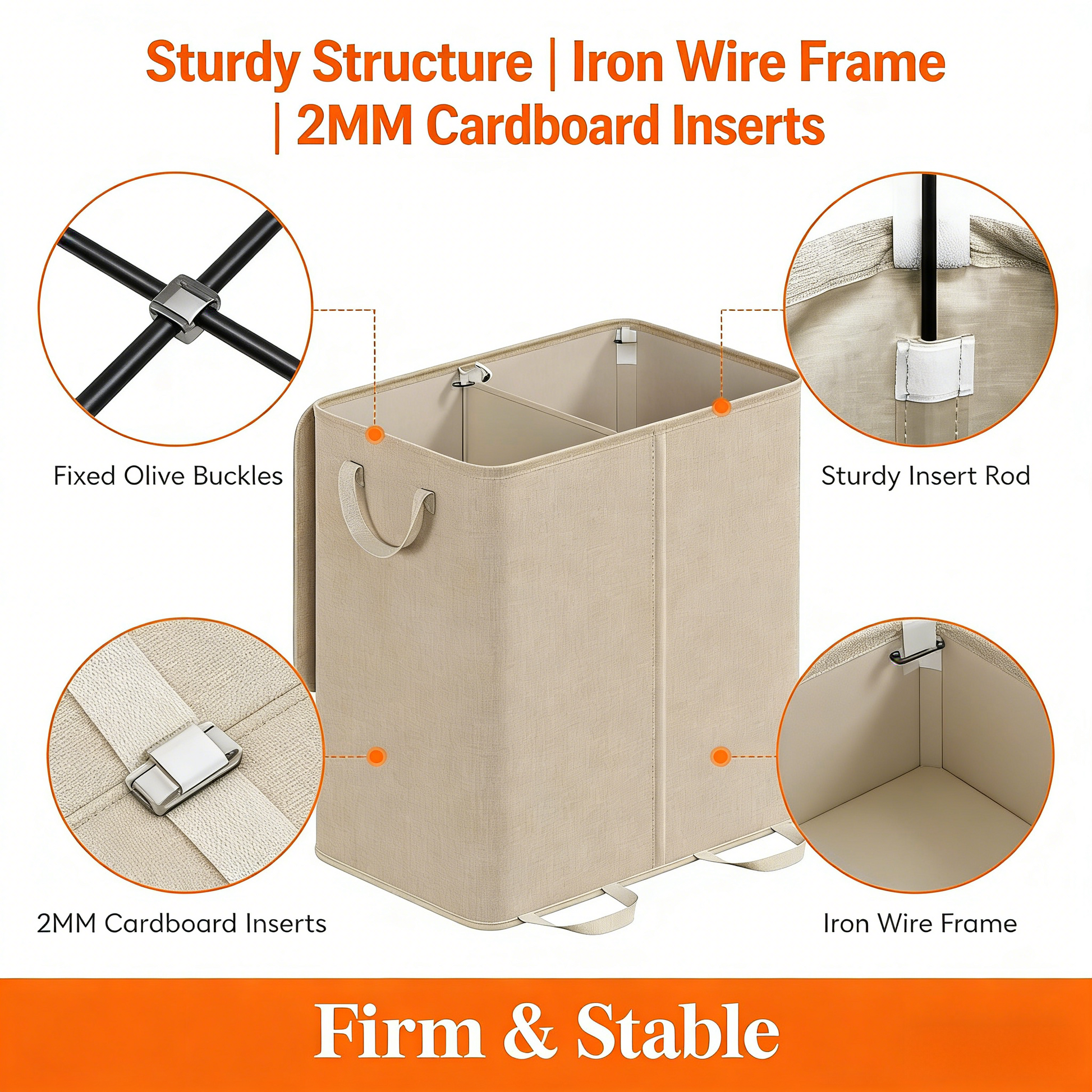 • Two Large Compartments: With 2 large divided sections, you can easily separate darks and lights, clothing from linens, his and her items, or child and adult pieces. Two included laundry bags with handles fits onto the double hamper firm and tight with drawstring stoppers. Use the handles to easily pull out the removable laundry bags with dirty laundry for wash.