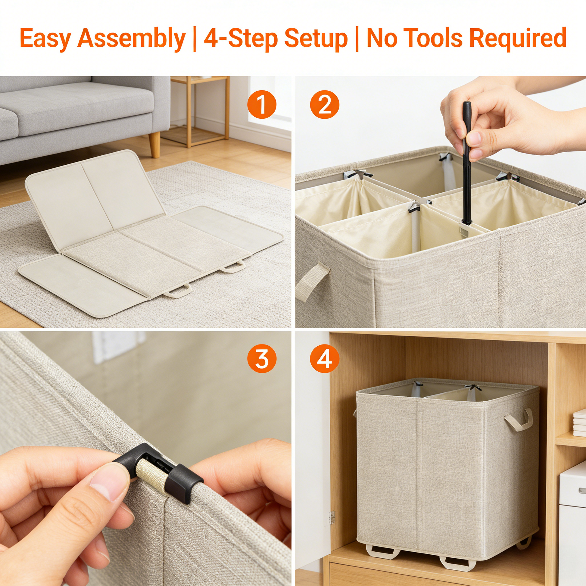 • Easy to Install: Simply put 6 supporting rods into the fixed insert tubes, tie 8 olive buckles into corresponding suspension loops, and the laundry bin is ready to use. Set up in minutes, and also folds flat for convenient storage when not in use.