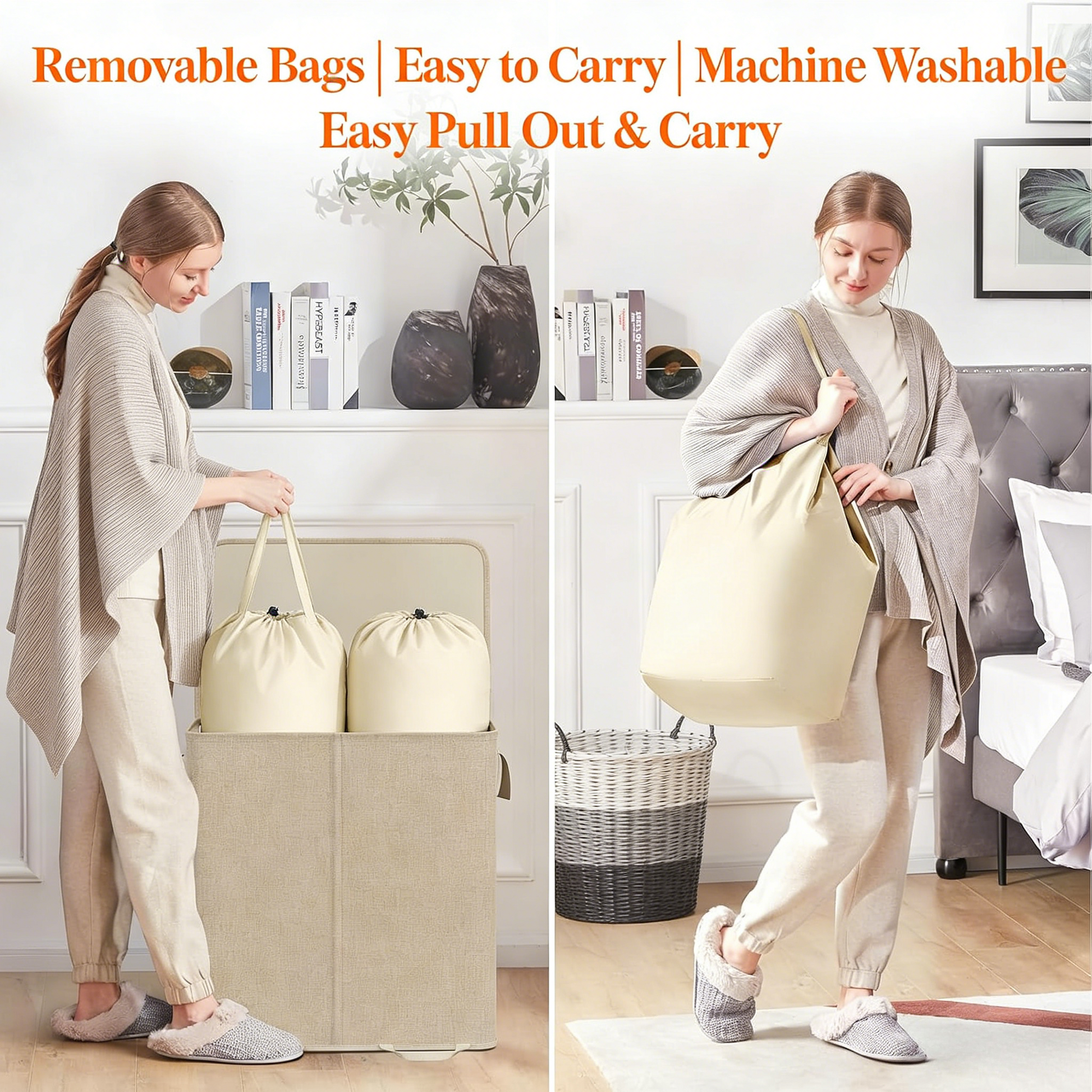 Double Laundry Hamper with Lid and Removable Laundry Bags, Large Collapsible 2 Dividers Dirty Clothes Basket with Handles for Bedroom